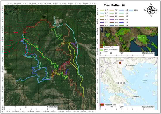 The research was conducted on Mount Paiko, located in Central Macedonia, northern Greece (Figure 1). Administratively, the area belongs to the Municipality of Pella, under the jurisdiction of the Forest Service of Edessa. The trail network under study extends for approximately 81.8 km, comprising fifteen hiking and four cycling routes (a total of 19 routes) that traverse a diverse forested landscape of beech, oak, and chestnut stands, interspersed with agricultural clearings and traditional settlements such as Elutherochori and Kromni. Elevations range from about 200 m in the lowlands to over 1650 m at the highest peaks, offering varied topography and scenic diversity.