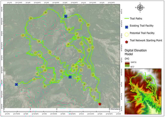 By combining the GIS-based spatial analysis with field observations, forty (40) potential locations were ultimately selected for further evaluation. These candidate sites represent the most appropriate positions for developing new resting and recreation facilities, balancing accessibility, technical feasibility, and environmental compatibility. The spatial distribution of the 40 proposed locations and the existing infrastructure is presented in Figure 2. Illustrative field photographs of selected Trail Facilities Potential Locations are provided in Figure A1.