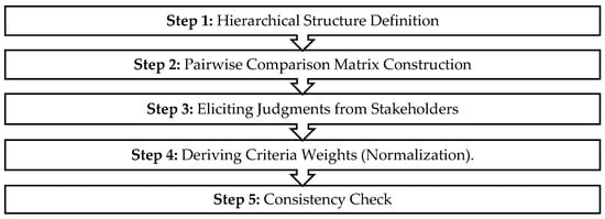The Analytic Hierarchy Process (AHP), originally introduced by Saaty (1987) [], is a structured method for multi-criteria decision analysis. It breaks down complex problems into a hierarchy consisting of an overall goal, a set of criteria and sub-criteria, and the available alternatives. This hierarchical organization enables decision-makers to systematically assess how each alternative contributes to the overall objective, taking into account multiple—often conflicting—factors. AHP combines quantitative data with expert judgment in a transparent and logically consistent framework, providing a clear rationale for prioritization. As shown in Figure 3, the procedure consists of five main steps. In the present application, AHP is used in a restricted way, namely only to obtain the relative weights of the five criteria through pairwise comparisons, without additional sub-criteria levels or comparisons at the alternative level.