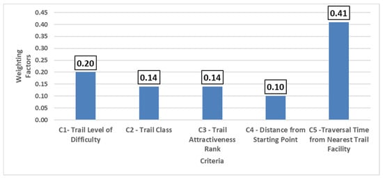 The resulting weight vector sums to 1.00 and represents the relative importance of each factor. Higher weights indicate criteria judged as more influential by the stakeholder panel in determining optimal trail facility locations. These weights were later used as inputs to the PROMETHEE II ranking procedure.
