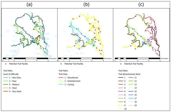 The third criterion—Trail Attractiveness Rank (C3)—was obtained from previous research, which ranked the trail paths in the specific study area based on their attractiveness []. In that study, a multi-attribute decision-making approach (MADM-VIKOR) was used to evaluate nineteen trail paths in Mount Paiko based on both physical and experiential attributes, including length, slope, percentage of natural trail surface, and view area coverage. The resulting attractiveness scores were normalized and aggregated through the VIKOR ranking process, yielding a composite Trail Attractiveness Rank for each trail. In the present research, these pre-established ranks were adopted to represent the relative attractiveness of the underlying trails associated with each potential facility location. Thus, sites located along trails of higher scenic or experiential value were assigned correspondingly higher attractiveness scores.