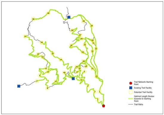 The spatially dependent criteria—Distance from Starting Point (C4) and Traversal Time from Nearest Trail Facility (C5)—were calculated through a GIS-based Network Analysis designed to quantify the accessibility of each candidate site within the trail system. These parameters reflect both the geometric configuration of the network and the physical effort required for visitors to reach or move between facilities.