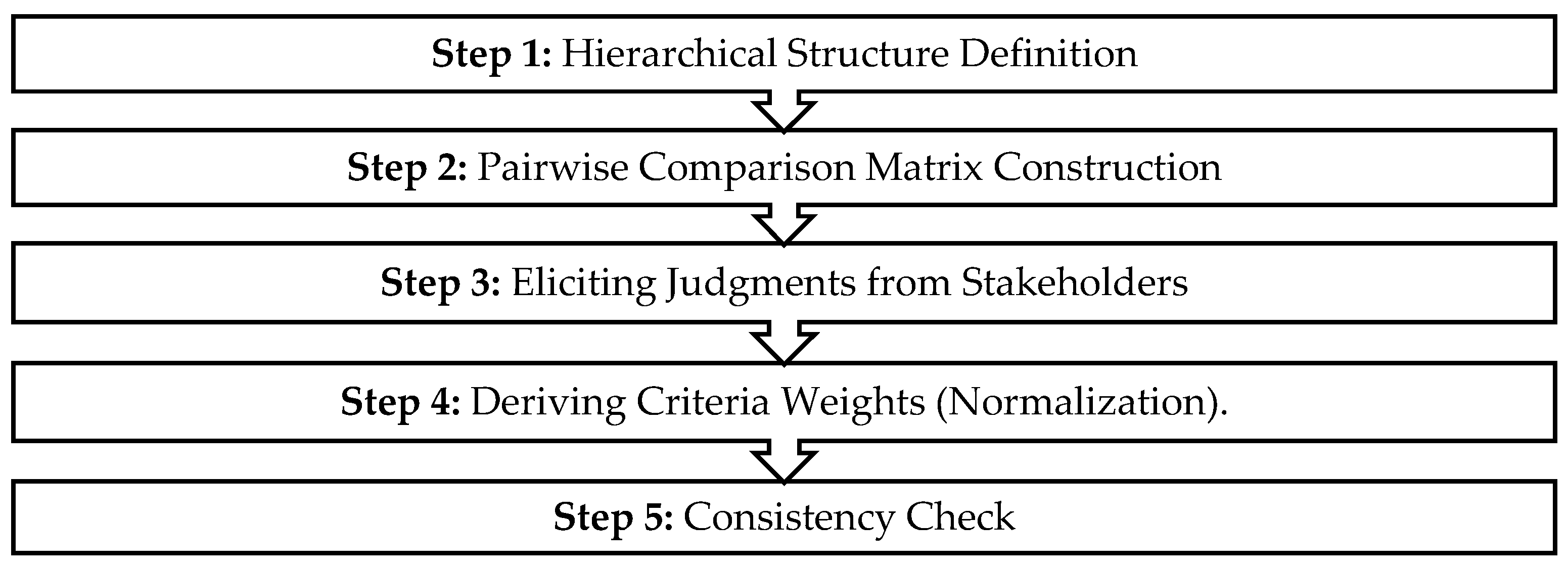 Figure 3, the procedure consists of five main steps. In the present application, AHP is used in a restricted way, namely only to obtain the relative weights of the five criteria through pairwise comparisons, without additional sub-criteria levels or comparisons at the alternative level.