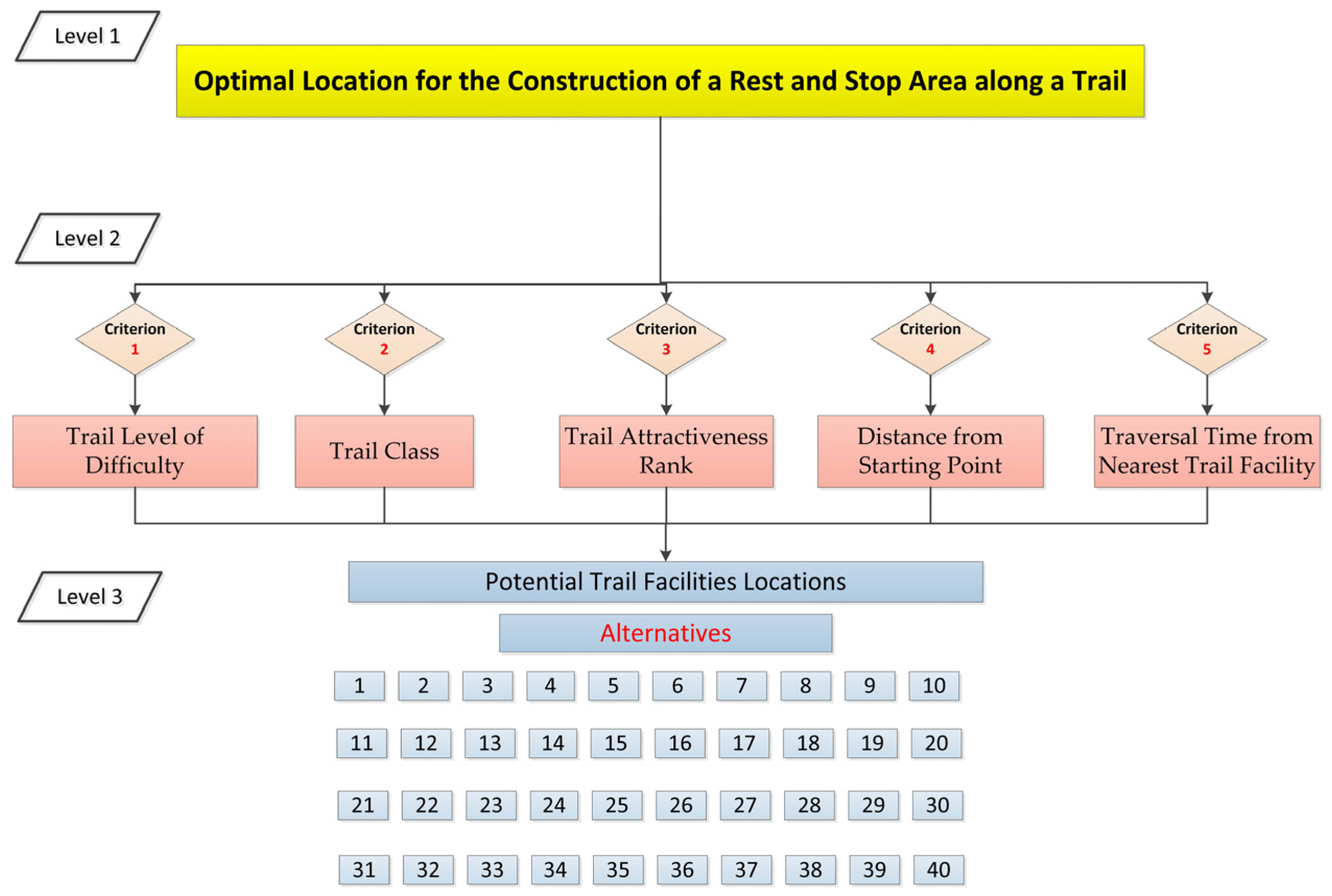 Figure 4, the top level of the hierarchy represents the overall goal—to identify the optimal locations for the construction of rest and stop areas along the trail network. The second level includes the five evaluation criteria (Trail Level of Difficulty, Trail Class, Trail Attractiveness Rank, Distance from Starting Point, and Traversal Time from Nearest Trail Facility), which capture both environmental and user-oriented aspects of trail design. The third level comprises the forty (40) potential trail facility locations derived from the GIS-based network analysis described in