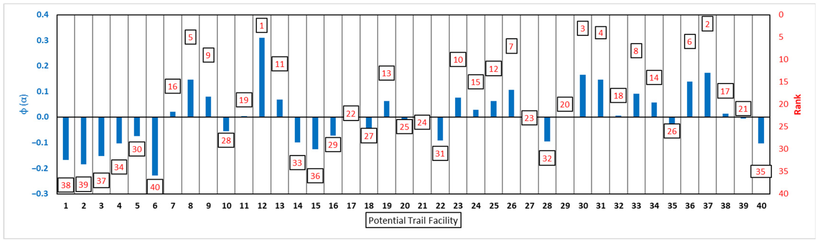 This procedure integrates both expert-derived importance weights and spatially measured criteria, producing a transparent and reproducible ranking of trail facility sites. PROMETHEE II thus enables a holistic evaluation where the best-ranked sites simultaneously maximize accessibility, attractiveness, and spatial equity while minimizing environmental or physical constraints.