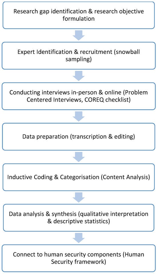 The interviews were transcribed and minimally edited to remove redundancies and interjections common in spoken language [22]. The data was analysed inductively using the content analysis methodology in MAXQDA software (version 24) [62,63], creating a coding scheme from the interview guidelines and the information provided by the respondents and refining it iteratively [64]. Each information was coded once per respondent to avoid duplication. Descriptive statistics were used to describe and summarise the data, analyse frequencies, and compare them among the experts [65,66]. Finally, we connected the impacts to each human security component following the criteria in Table 1. The transcripts and coding scheme of the interviews are published in an online data repository (see Supplementary Data). Figure 2 depicts the stepwise methodological framework in a concise flow chart.