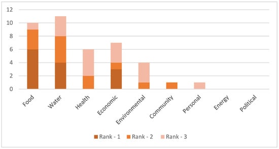 We asked the experts to rank the first three human security components that they perceive to be most vulnerable to climate change impacts (Figure 4). Experts repeatedly identified food, water, economic, health, and environmental security as most at risk. The majority (6) placed food security in the first place, followed by water security (4) and economic security (3). Interestingly, none of the experts identified energy or political security as the top three.