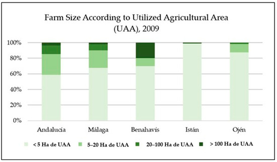 Figure 5. Farm size according to Utilized Agricultural Area (UAA). Comparative analysis between municipalities within the study area, the province of Málaga, and Andalusia. Source: own elaboration based on Agricultural Census [21]. - -