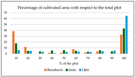 The distribution of plots according to the percentage of land devoted to agricultural activity reveals differentiated dynamics among the municipalities studied, as shown in Figure 6. In Benahavís, the pattern is markedly polarized: nearly 40% of the plots allocate barely 10% of their surface to agriculture, while 32.7% are entirely dedicated to it.