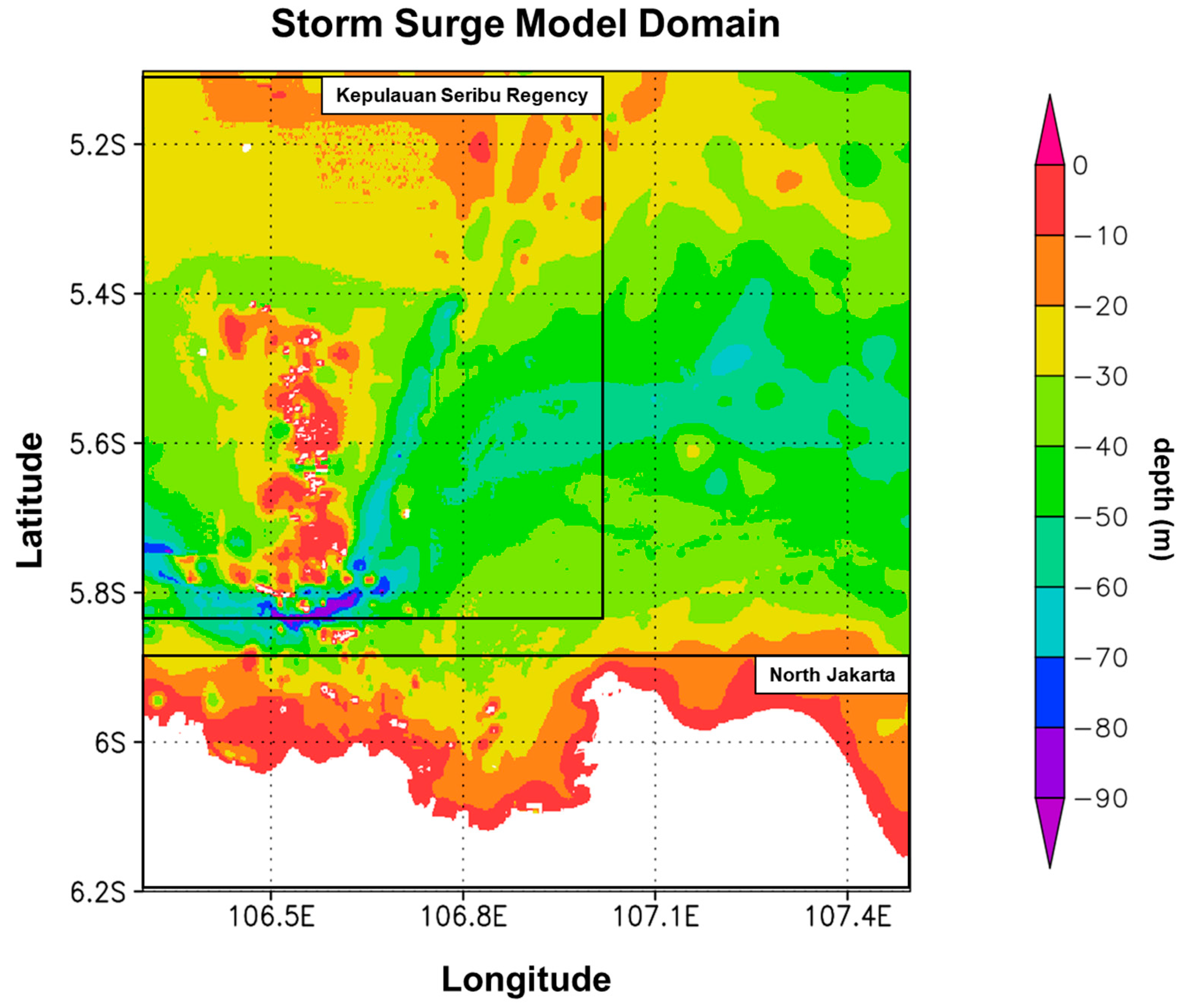 - Ningsih, N.S.; Hanifah, F.; Yani, L.F.; Rachmayani, R. Simulated Response of Seawater Elevation and Tidal Dynamics in Jakarta Bay to Coastal Reclamation. Ocean Dyn. 2024, 74, 211–221. [Google Scholar] [CrossRef]