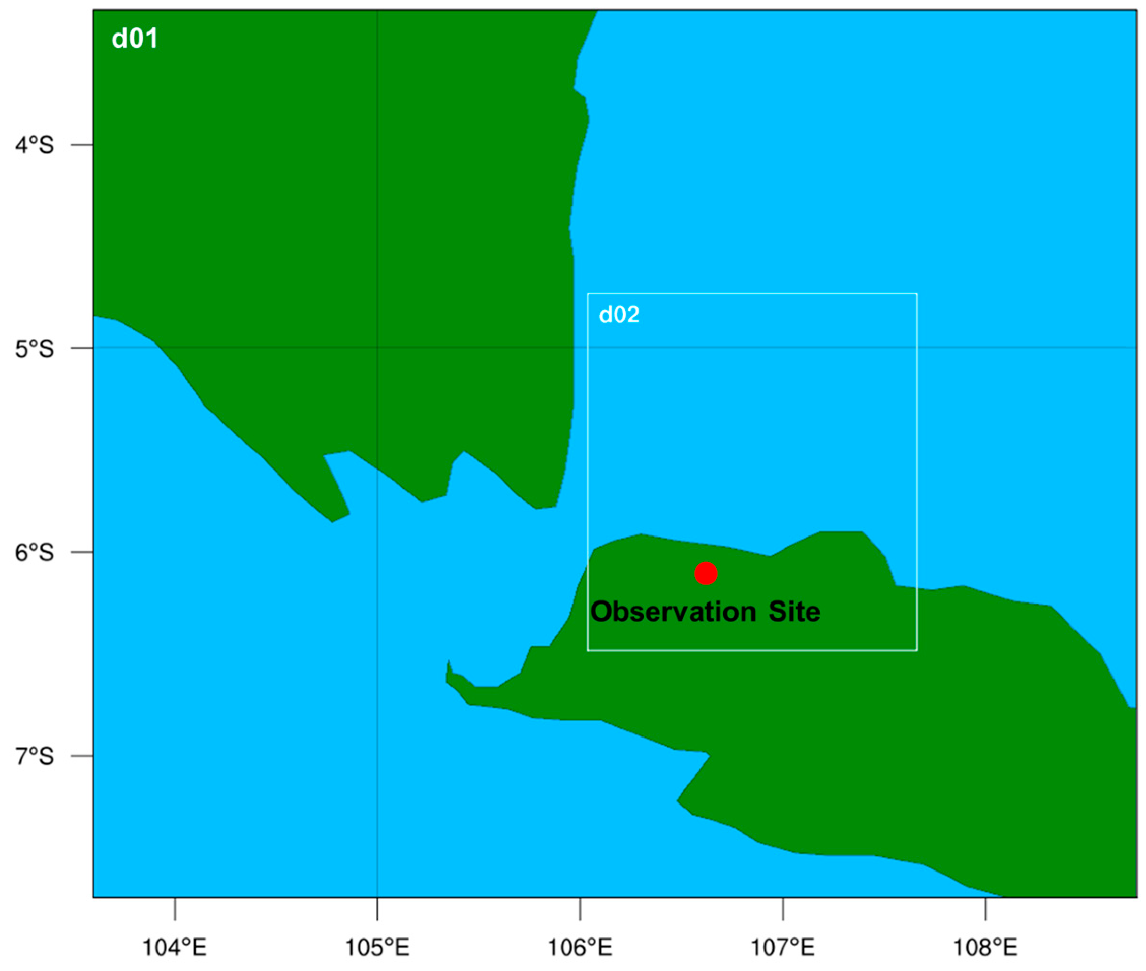 - Trilaksono, N.J.; Otsuka, S.; Yoden, S. A Time-Lagged Ensemble Simulation on the Modulation of Precipitation over West Java in January–February 2007. Mon. Weather Rev. 2012, 140, 601–616. [Google Scholar] [CrossRef]
