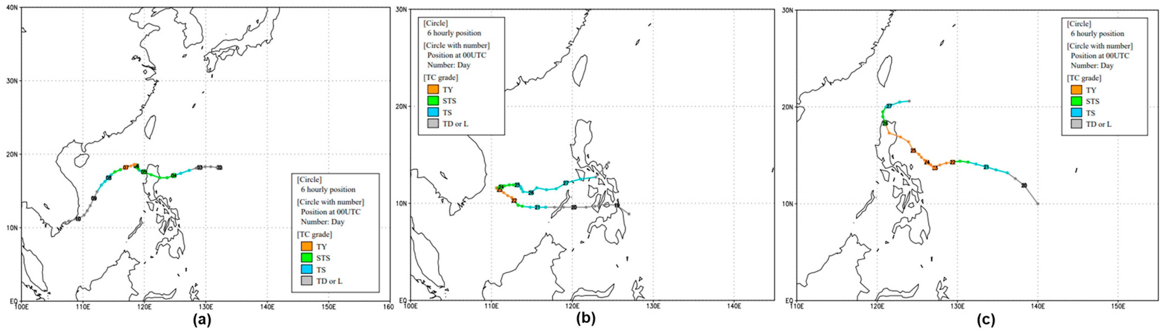 - Japan Meteorological Agency. Annual Report on the Activities of the RSMC Tokyo-Typhoon Center 2007; Japan Meteorological Agency (JMA): Tokyo, Japan, 2007. Available online: https://www.jma.go.jp/jma/jma-eng/jma-center/rsmc-hp-pub-eg/AnnualReport/2007/Text/Text2007.pdf (accessed on 12 October 2025).