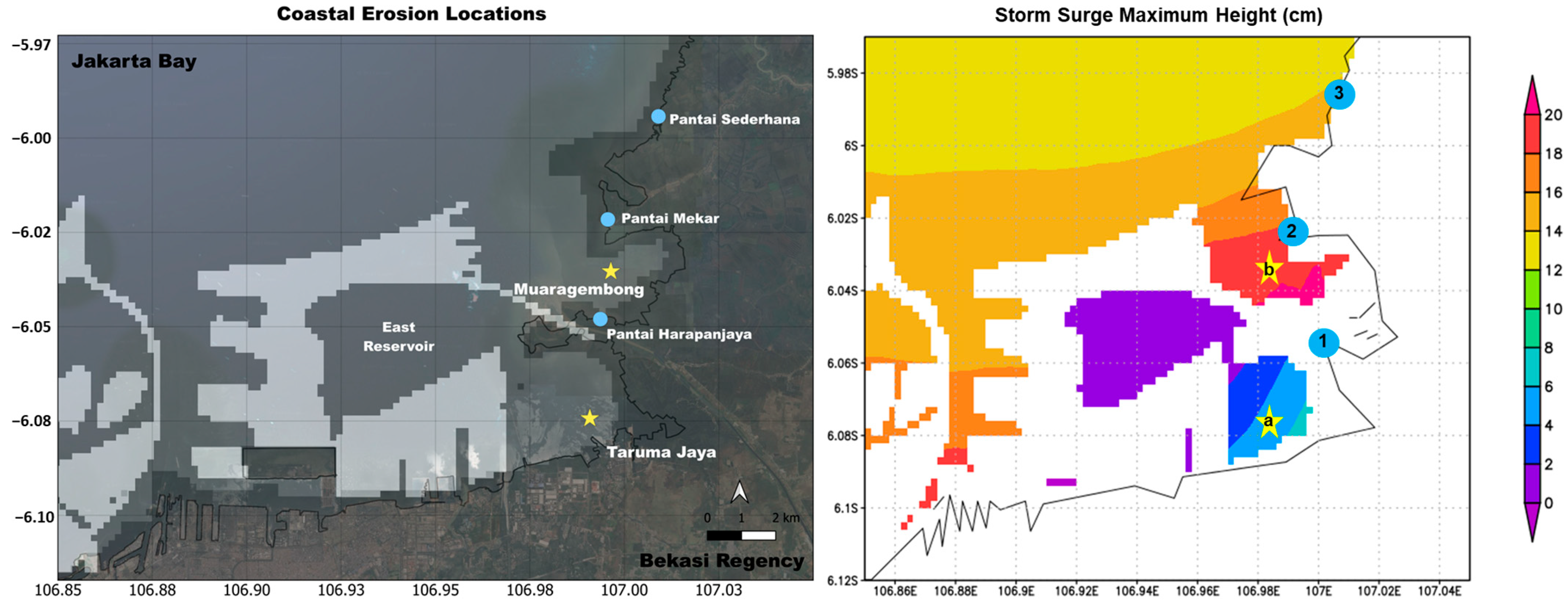 - Solihuddin, T.; Triana, K.; Rachmayani, R.; Husrin, S.; Pramudya, F.A.; Salim, H.L.; Heriati, A.; Suryono, D.D. The Impact of Coastal Erosion on Land Cover Changes in Muaragembong, Bekasi, Indonesia: A Spatial Approach to Support Coastal Conservation. J. Coast. Conserv. 2024, 28, 43. [Google Scholar] [CrossRef]