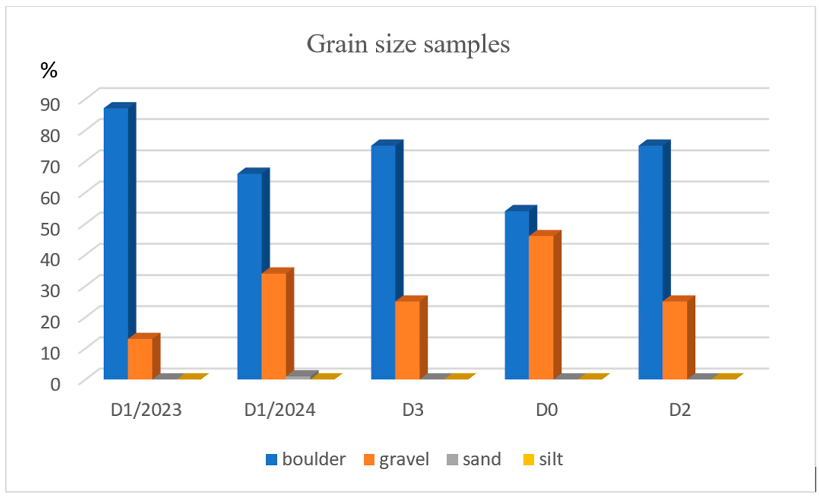 | D1/2023 | −2.658: Fine Gravel | 1.425: Poorly Sorted | 0.296: Fine Skewed | 1.047: Mesokurtic |