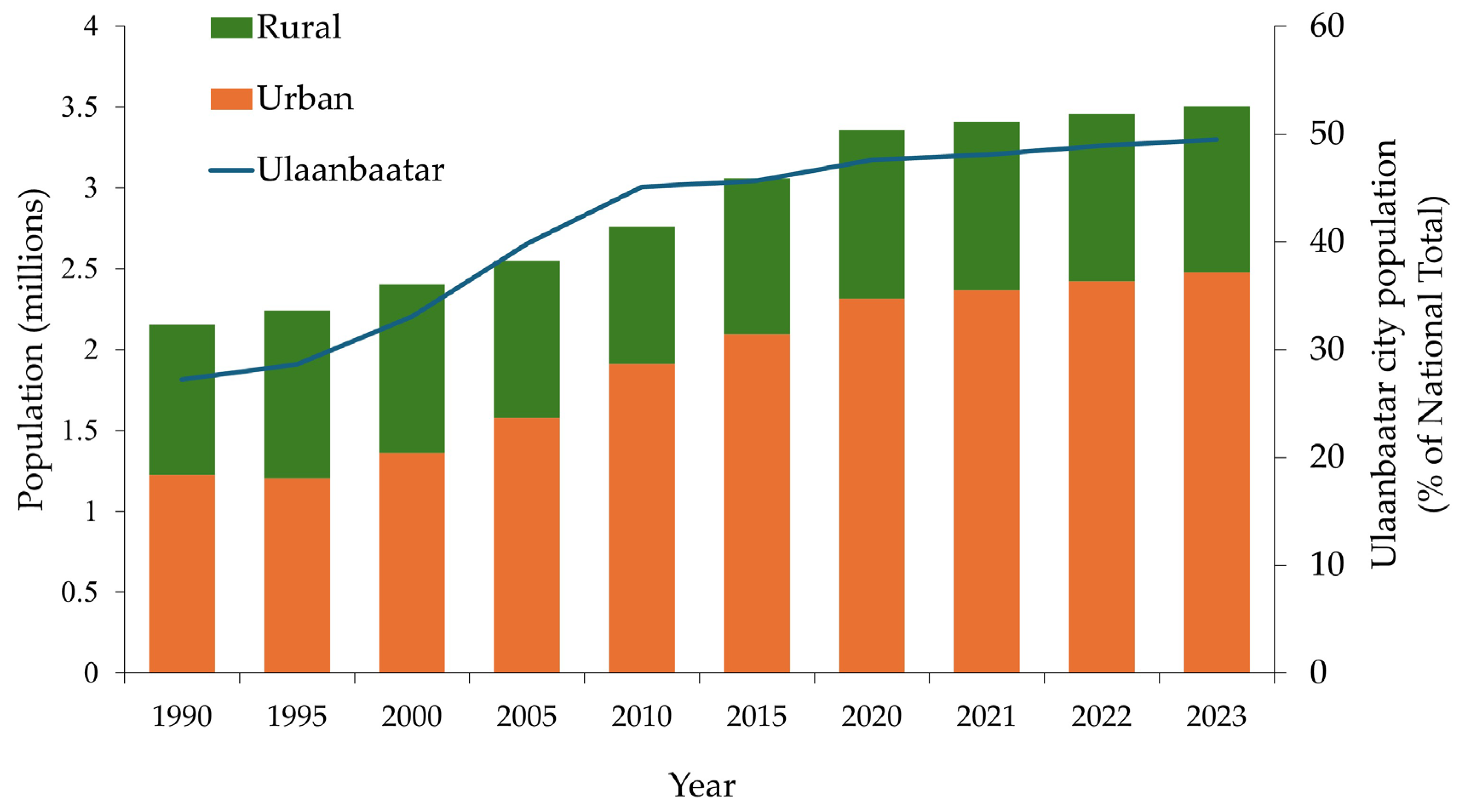 These global patterns are clearly reflected in Mongolia’s capital, UB, a rapidly growing city located in a cold semi-arid climate that concentrates a large proportion of the national population. Nearly half of Mongolia’s population lives in UB, occupying only 0.3% of the country’s territory.