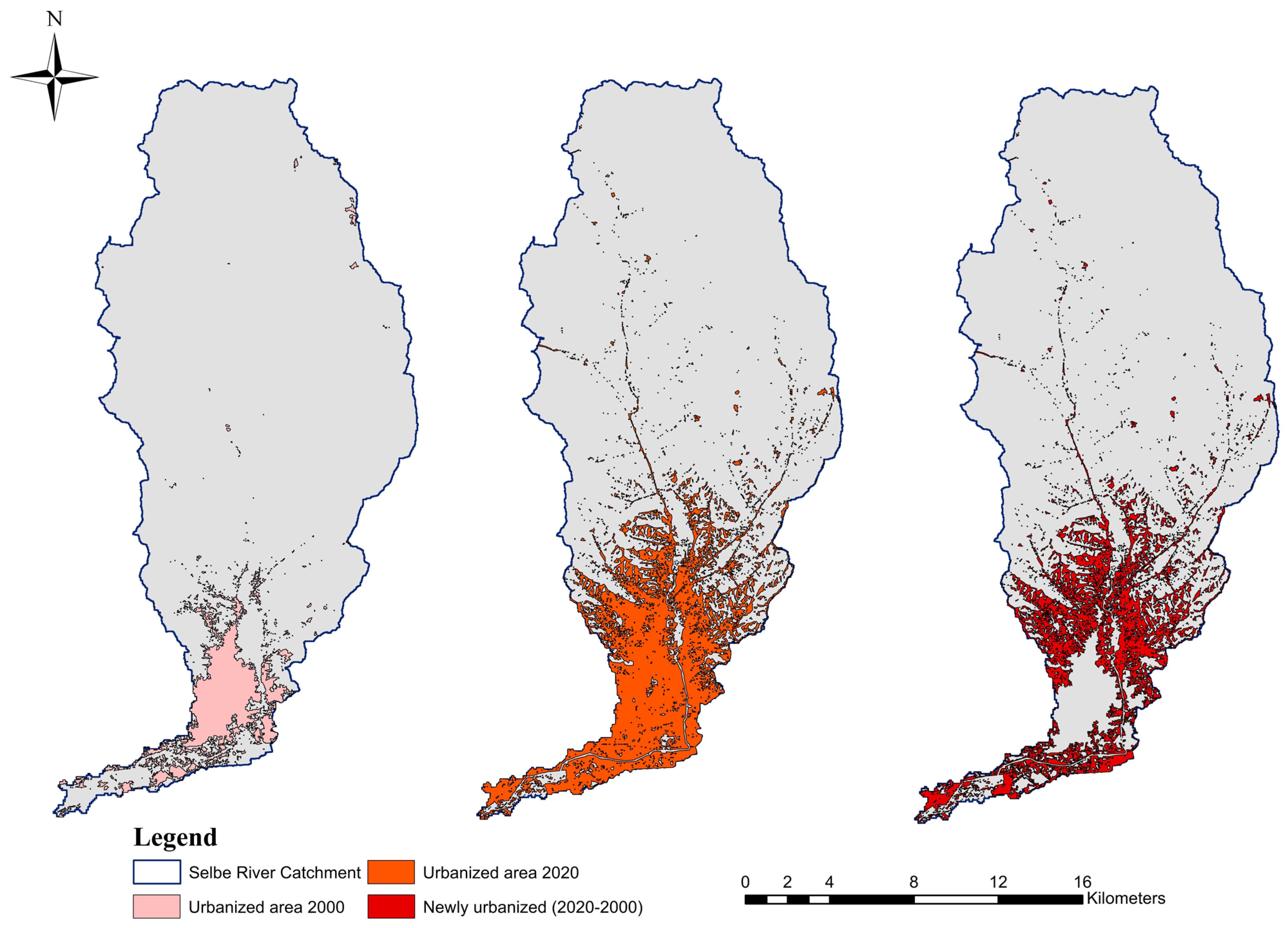 17], leaving the downstream dynamics underexplored. Urban expansion has been shown to significantly reshape watershed processes by increasing impervious surfaces, altering runoff regimes, and reducing infiltration capacity. In UB, rapid growth and land use changes have intensified these pressures, placing tributaries such as the Selbe River at heightened risk of ecological degradation and hydrological imbalance [