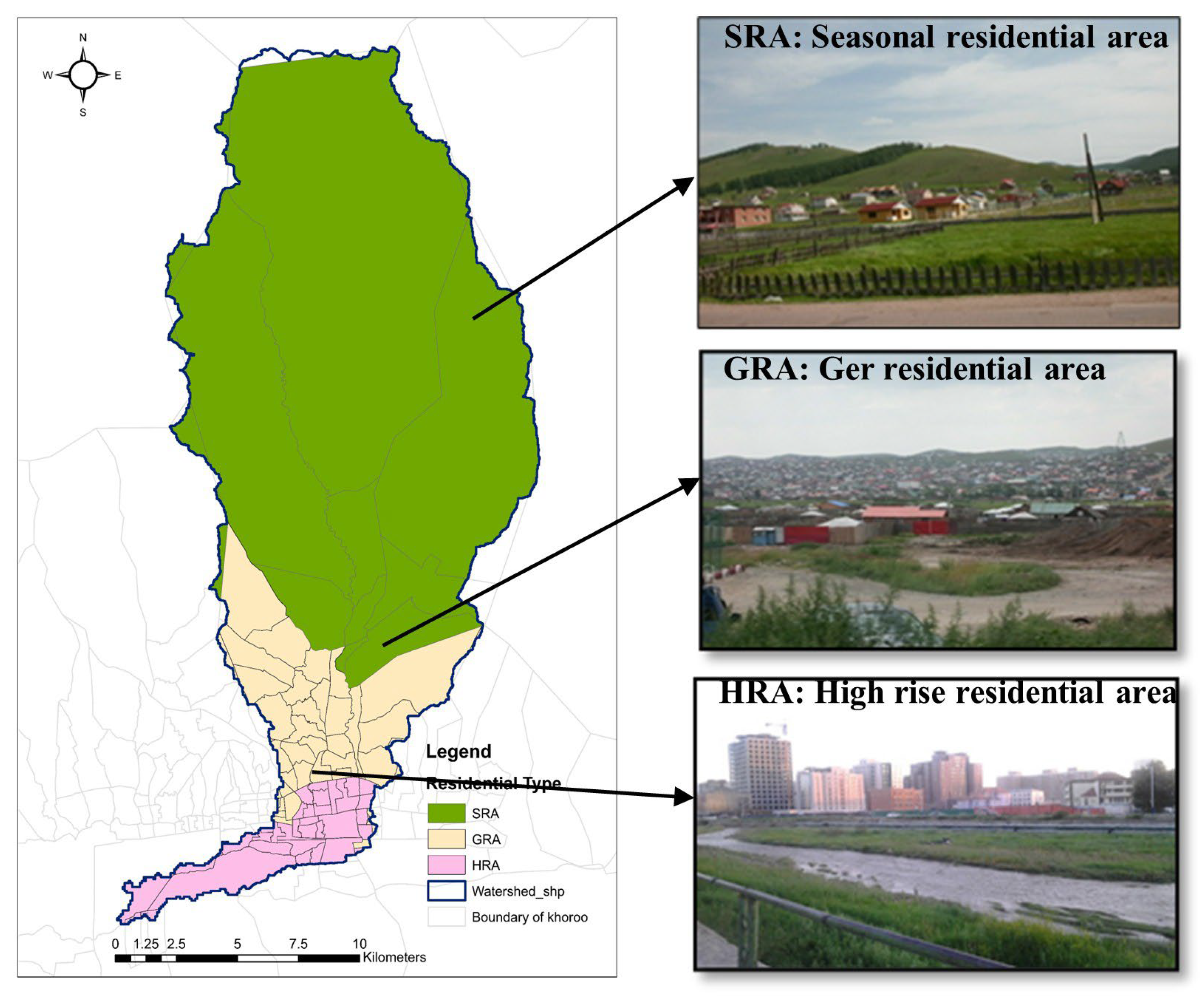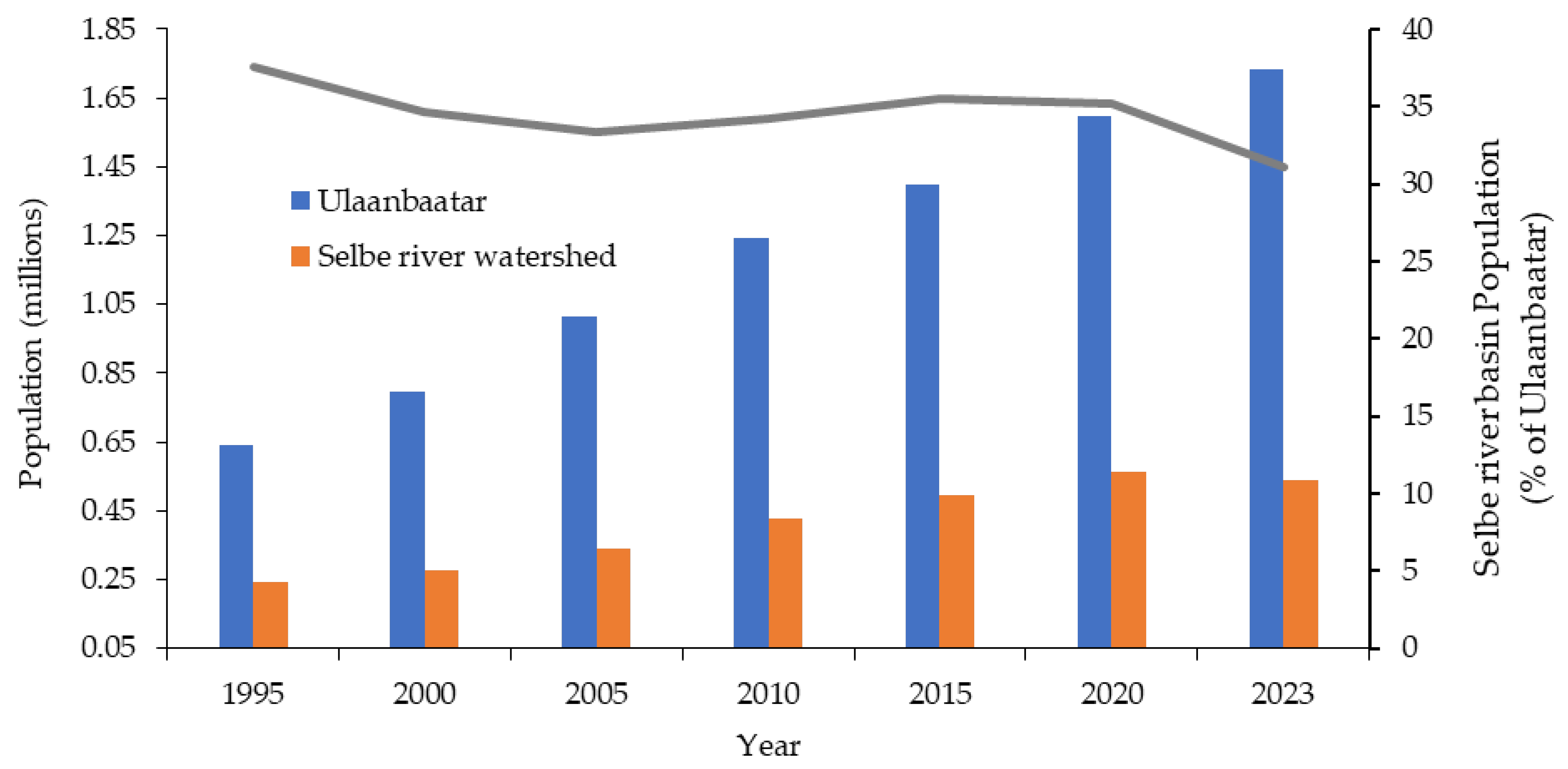 14]. However, research on smaller urban tributaries such as the Selbe River in Ulaanbaatar (UB) remains limited, particularly in cold semi-arid regions where urbanization pressures are concentrated in specific geographic areas.