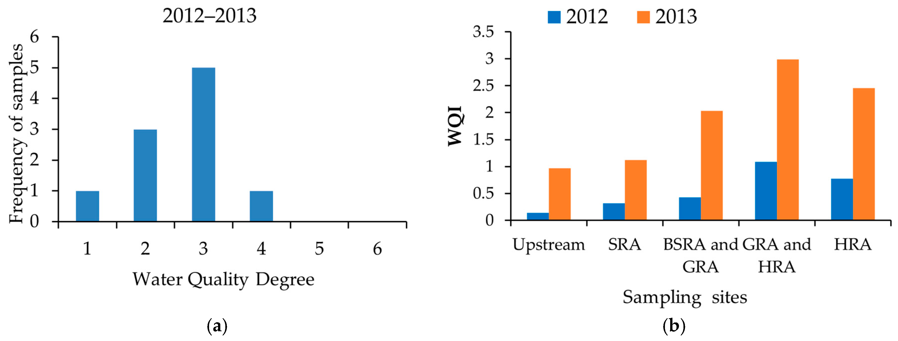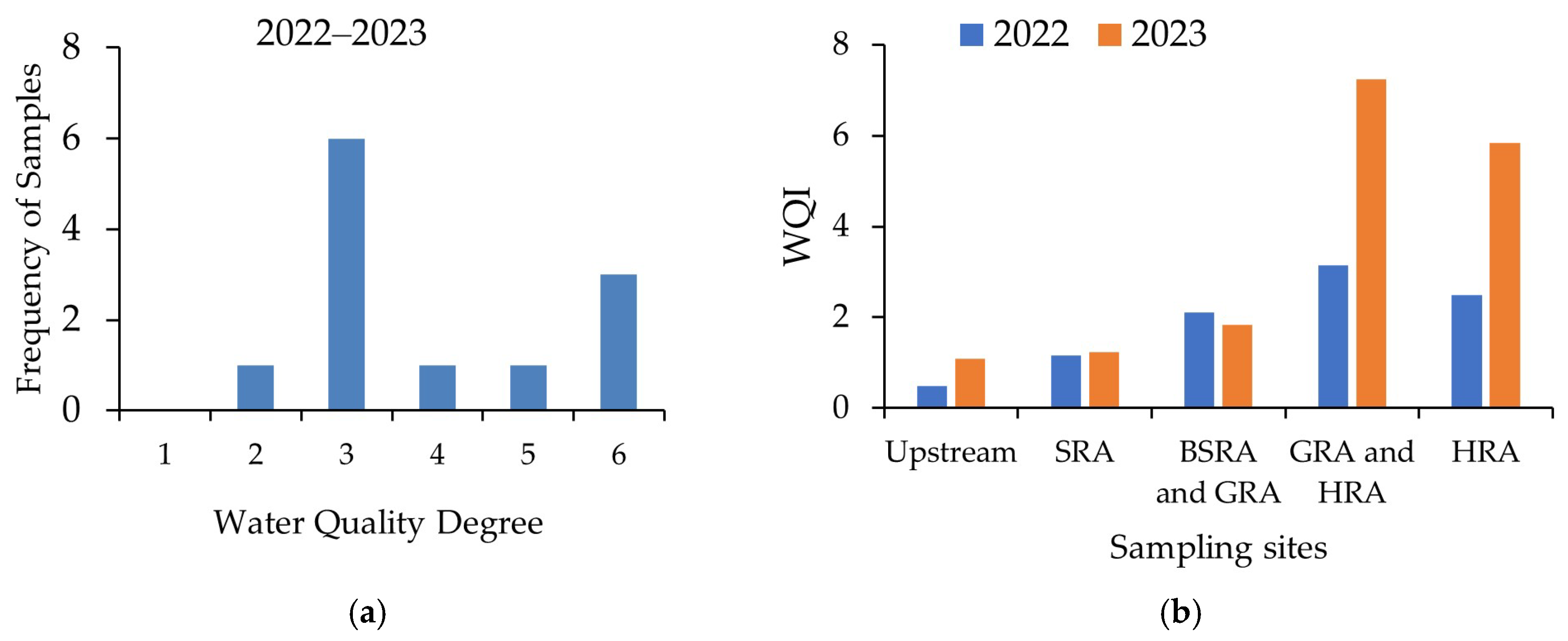 43−, and SS, the Water Quality Index (WQI) was calculated and applied to classify each sample according to the national system (