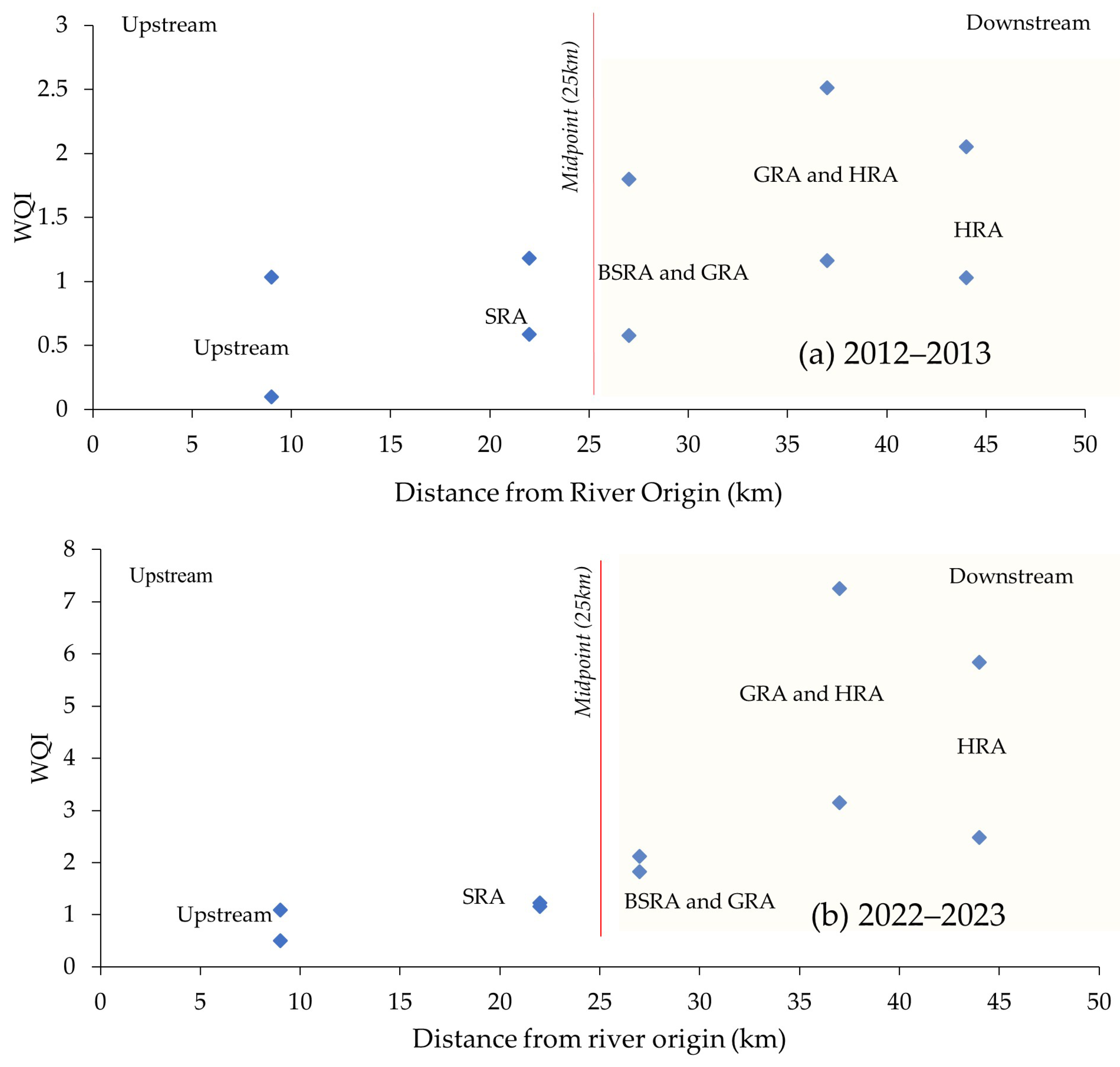 Longitudinal WQI comparison along the Selbe river (2012–2013 vs. 2022–2023). (a) WQI values plotted against distance from the river origin during 2012–2013. (b) WQI values plotted against distance from the river origin during 2022–2023. The red vertical line indicates the midpoint of the river (25 km). Blue diamond symbols represent sampling sites. Yellow shading indicates urbanized zones. The river is divided into upstream and downstream sections based on the midpoint.