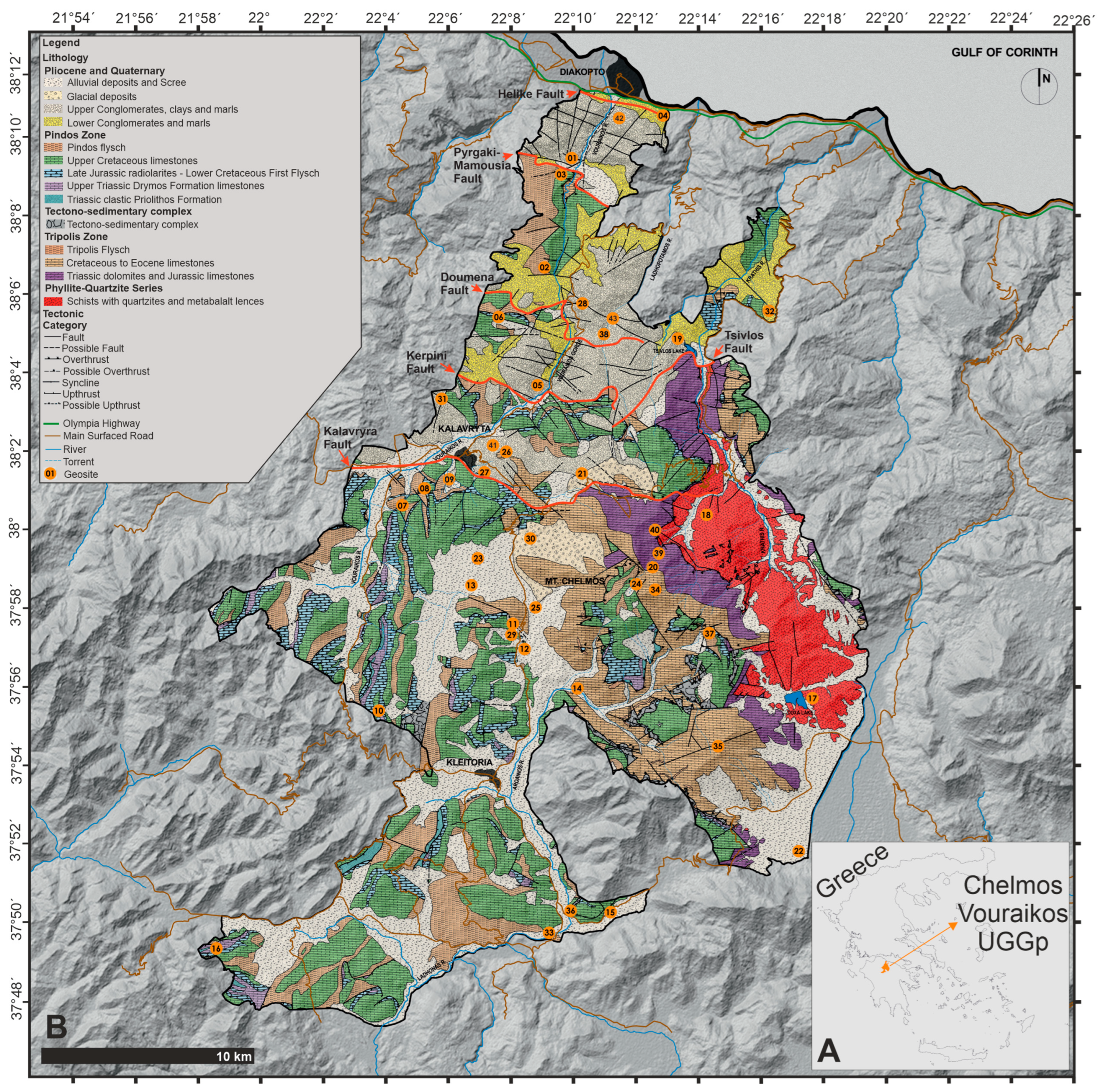 - Golfinopoulos, V.; Papadopoulou, P.; Koumoutsou, E.; Zouros, N.; Fassoulas, C.; Zelilidis, A.; Iliopoulos, G. Quantitative Assessment of the Geosites of Chelmos-Vouraikos UNESCO Global Geopark (Greece). Geosciences 2022, 12, 63. [Google Scholar] [CrossRef]