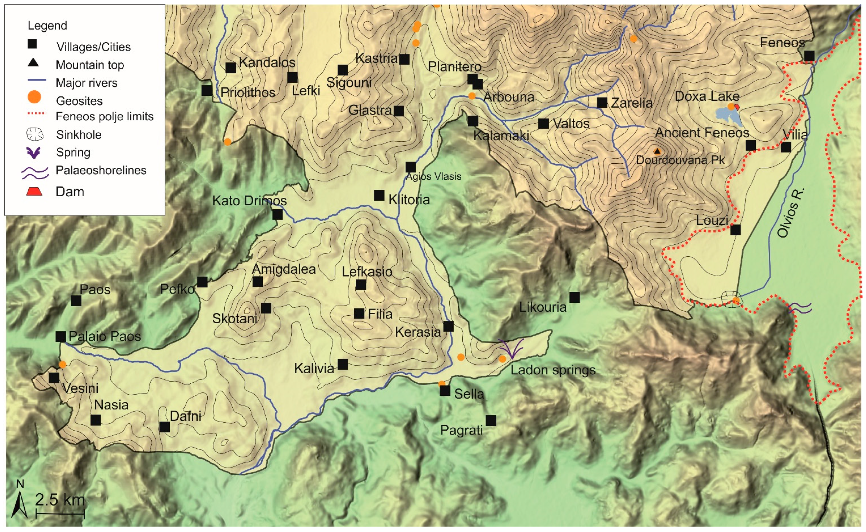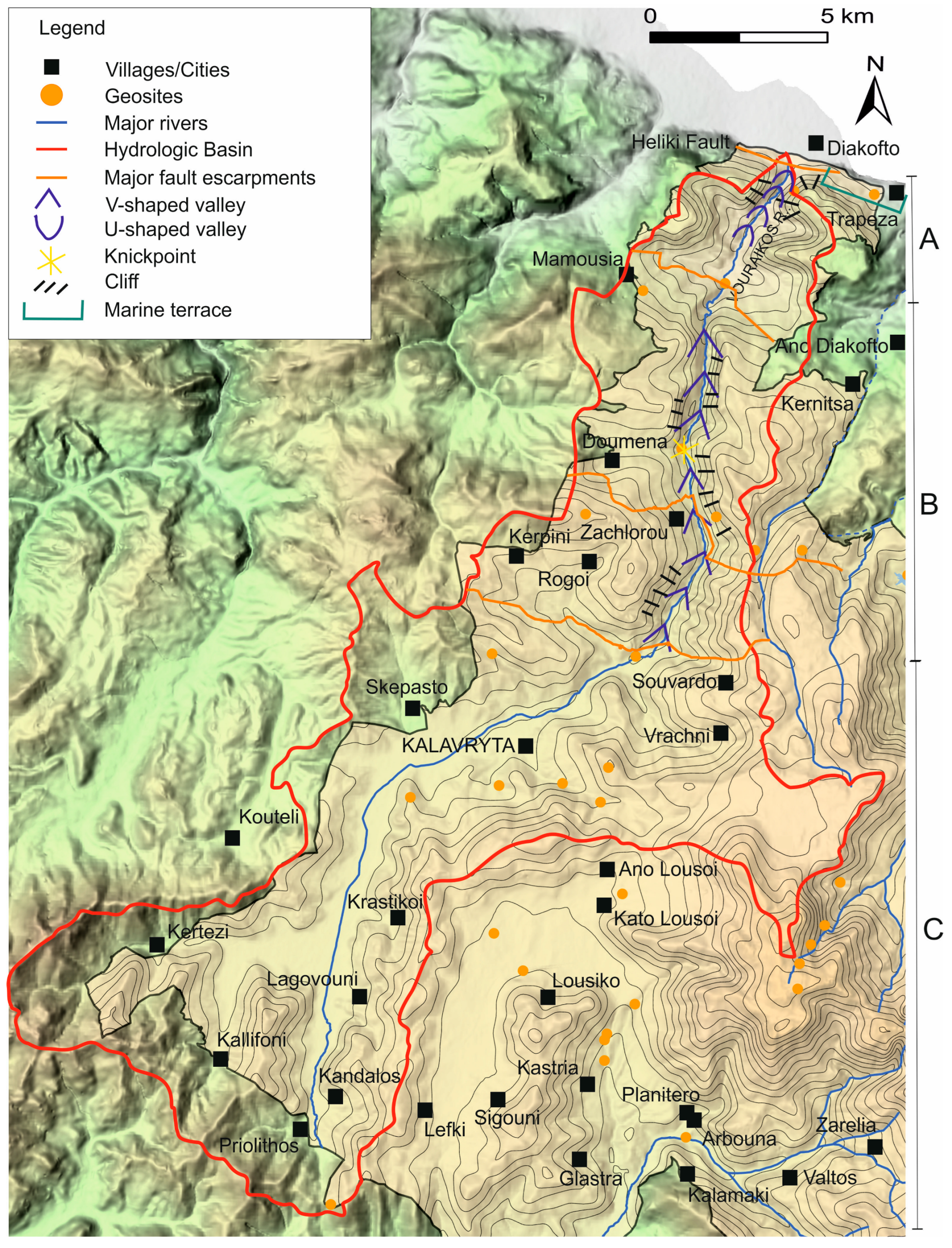 - Pavlopoulos, K.; Fouache, E. Geomorphological Challenges and Mapping of the Vouraikos Basin North Peloponnesus, Greece. In Proceedings of the 33rd International Geographical Congress, Beijing, China, 21–25 August 2016. [Google Scholar]