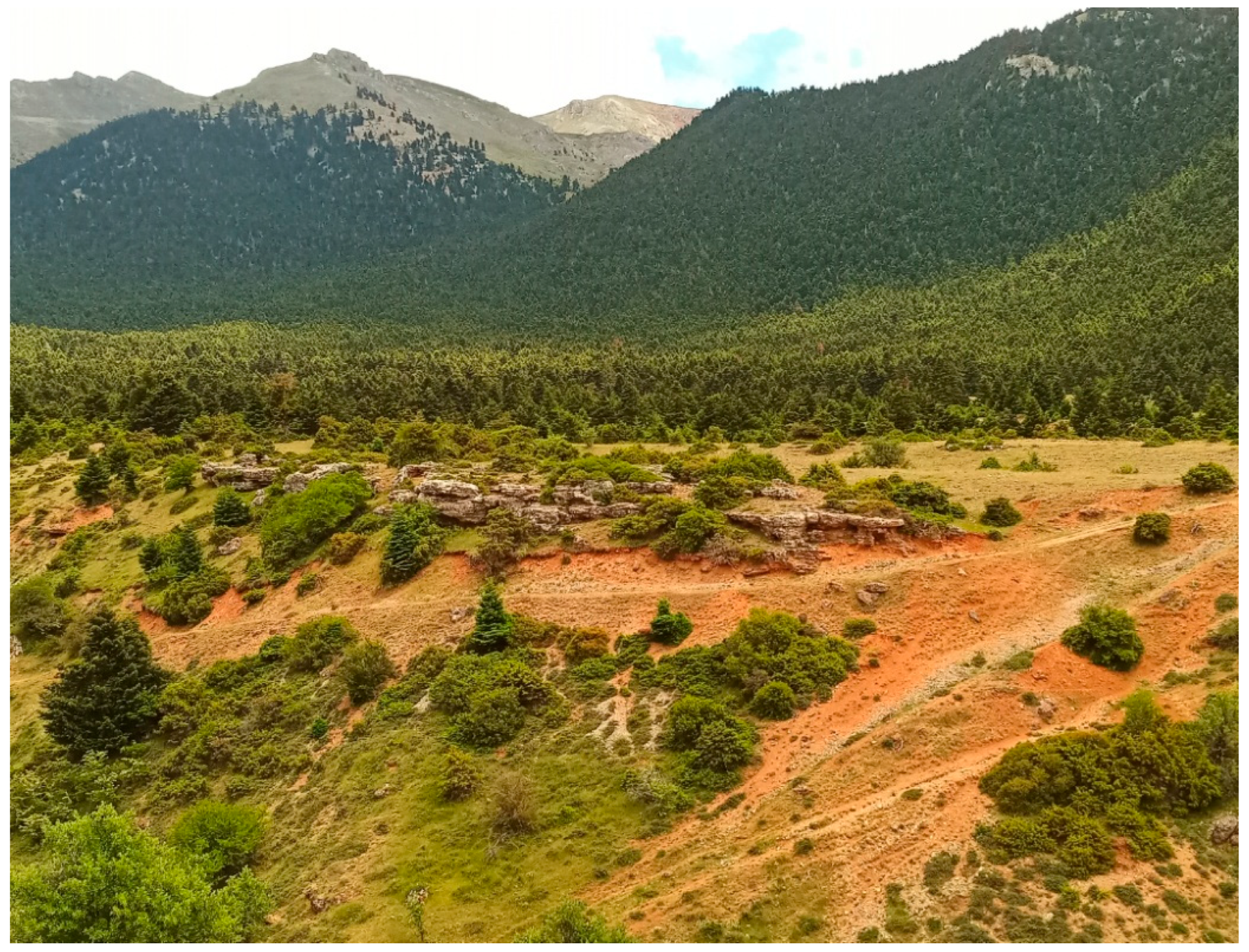 - Saroglou, H.; Marinos, V.; Tsiambaos, G.; Marinos, P.; Lykoudi, E.; Zarris, D. Erosion Hazard Assessment in “Natura” Regions Affected by Wildfires: A Case from Peloponnese, Greece. In Proceedings of the Geologically Active Proceedings of the 11th IAEG Congress, Auckland, New Zealand, 5–10 September 2010; pp. 5–10. [Google Scholar]