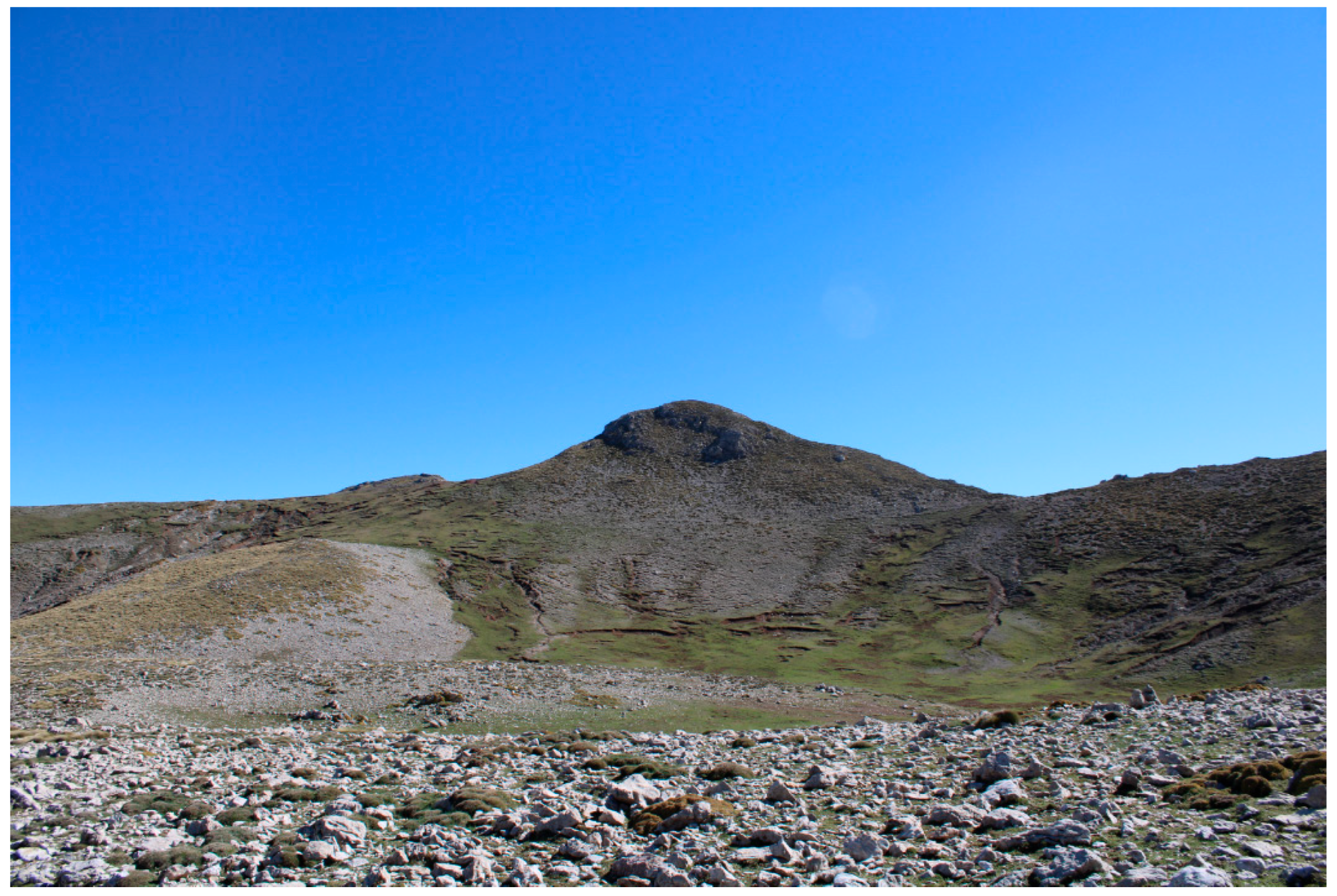 - European Environment Agency (EEA). Eastern Mediterranean Base-Rich Scree (H3.2E). EUNIS Habitat Classification; European Environment Agency: Copenhagen, Denmark, 2016. [Google Scholar]