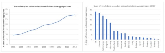 (Left) Share of recycled and secondary materials in GB aggregate sales and (Right) share of recycled and secondary materials in total aggregate sales (in 2018) (Mineral Products Association, 2019).