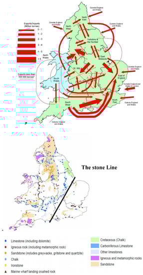 (Top) Hard rock reserves in the UK (Reproduced with kind permission from the British Geological Survey (for supporting information see: [48]. (Bottom) Crushed rock inter-regional flows within England and Wales (2014) [17].