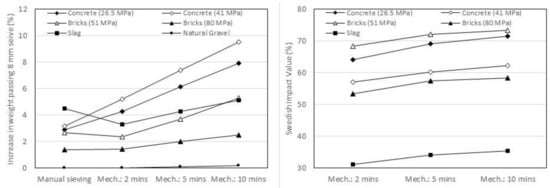 Schouenborg, Aurstad and Pétursson (2004) [76] demonstrated that many aggregates, including a PA, are sensitive to traditional test methods, such as mechanical sieving; the abrasive process of mechanical sieving can lead to unrepresentative particle size distribution and can influence other properties, such as aggregate impact value: a measure of resistance to sudden impact, see Figure 4 [79], and yet, demolition waste and colliery spoil have successfully been used in geotechnical applications previously [82,83]. This highlights the importance of understanding the material properties and selecting appropriate engineering applications together with suitable construction methods.