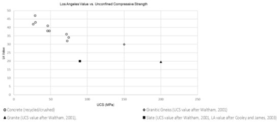 This method may be suitable to replicate the experience of aggregates in the wearing course of highways, but it does not necessarily reflect that of confined aggregates. This could mean that some AAs, which may look poor when assessed using LA values, will perform well in certain applications (see Figure 5). An example of this is crushed concrete. Whilst the AAs appear to have high LA and low UCS values (see Figure 5), these AAs have been a real success story [85,86,87].