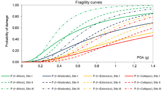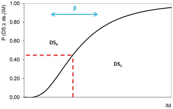A critical aspect in the assessment of losses is the development of appropriate models to determine the vulnerability of structures against seismic hazard. Fragility functions constitute vital components of such models. Fragility functions (i.e., fragility curves, fragility surfaces) constitute functional forms that link the probability of exceeding a predefined level of damage, caused by a hazard on a structure, with a selected measure used to describe the severity of this hazard. The level of damage is commonly expressed by a set of discrete Damage States (DS), which are bounded Limit States (LS) or damage levels, corresponding to given thresholds, i.e., values of predefined, representative for the examined structure, EDPs. The severity of the examined natural hazard is expressed by an IM, for instance, the Peak Ground Acceleration (PGA) [33,34]. Fragility functions (e.g., Figure 1) for tunnels and underground structures are commonly expressed in the form of curves, following a lognormal probability distribution [35], such as: