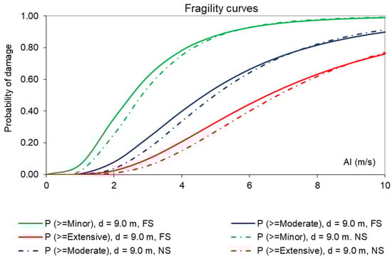 Huang et al. [53] proposed an analytical method for the development of fragility curves for the assessment of rock mountain tunnels against ground shaking. The selection of the examined rock tunnel configurations was made using the Uniform Design Method (UDM), a method used to design experimental setups, accounting for uncertainties associated with ground motion characteristics, lining and rock mass properties, and tunnel depth. Dynamic analyses were performed for the selected configurations using FLAC 3D, adopting elastic models for the simulation of the tunnel liners and the rock mass, and by assuming two limit cases, with regard to the rock–tunnel interface conditions, i.e., no-slip and full-slip interface conditions. EDP and damage state thresholds were defined following Argyroudis and Pitilakis [52], while Arias Intensity (Ia) was used as IM. The Support Vector Machine (SVM) method was employed to develop a prediction model of the relationship between the selected EDP and the seismic IM (i.e., the Probabilistic Seismic Demand Model, PSDM). The output from dynamic analyses was used to train the prediction model, which was then used to forecast the structural seismic demand for a given IM, calculate the structural capacity, and conclude with an estimation of the probability function at different seismic IM levels. The analyses were carried out for two circular tunnels, with diameters d = 9 m and 12 m, and burial depths ranging between 44 m and 200 m. The efficiency of the proposed method to establish PSDM was examined by comparing its predictions against the ones of the ‘traditional’ approach (i.e., using regression analyses of EDP-IM datasets derived from dynamic analyses). To the researchers, the comparisons revealed comparable predictions in fragilities, with the proposed method leading to a 10% reduction in calculation times compared to traditional approaches. Moreover, by employing the null hypothesis test, it was found that the uncertainties related to tunnel depth had a higher effect on computed fragilities, with properties of rock mass and properties of the lining following. The rock–tunnel interface conditions were also found to affect, to some extent, the fragility of examined tunnels (Figure 2). The researchers compared their analytical fragility curves with empirical fragility curves, reporting differences.
