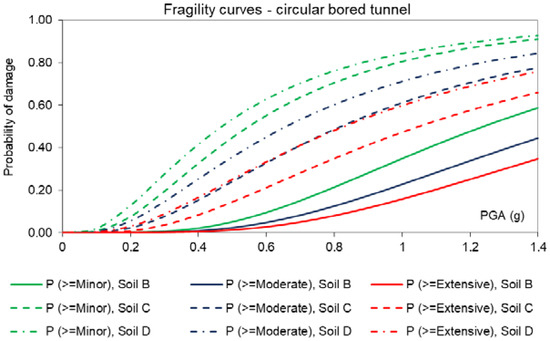 Argyroudis and Pitilakis [52] provided the first detailed numerical framework for the development of fragility curves for the assessment of tunnels in soft soils. An uncoupled analysis approach was employed to compute the response of examined soil–tunnel configurations against ground seismic shaking. The nonlinear response of soil was accounted for via 1D equivalent linear soil response analyses, carried out using appropriate G-γ-D curves for selected soil deposits (gravel, sand, clay deposits). These analyses provided strain compatible stiffness values for the soil under various ground motions and shaking levels, which were then used as input values in 2D plane strain models of the soil–tunnel systems, used to compute the response of the liners of tunnels. A pseudo-static approach was used to simulate the effect of ground shaking on the response of tunnels, with ground displacements being introduced on the boundaries of the numerical models, as per the detailed equivalent static analysis method presented in ISO 23469 [58]. The analyses were performed using FE code PLAXIS 2D. From these analyses, the maximum bending moment of the lining was identified. Proper interface elements were used in the soil–tunnel interface (reducing factor R = 0.7). The level of damage (i.e., damage states) was expressed based on the ratio of the maximum bending moment acting on the liner over the capacity bending moment of the liner (M/MRd), the latter defined based on a separate section analysis, considering, indirectly, the axial seismic forces acting on the liner. The analyses were conducted for a circular tunnel, with diameter d = 10 m and lining thickness t = 0.50 m, embedded in various soil deposits, corresponding to soil classes B, C and D (acc. to EN1998-1 [59]) at a depth h = 10 m. Nine real ground motions, scaled from 0.1 g to 0.7 g, were used to calculate the induced stress on tunnel liners for an increasing level of ground shaking. Analytical fragility curves were defined for four damage states, i.e., minor damage, moderate damage, extensive damage, and collapse, using PGA at the ground surface in free field conditions as seismic IM. The analyses revealed the critical effect of soil deposit characteristics on the computed fragility of the examined tunnel (Figure 4).