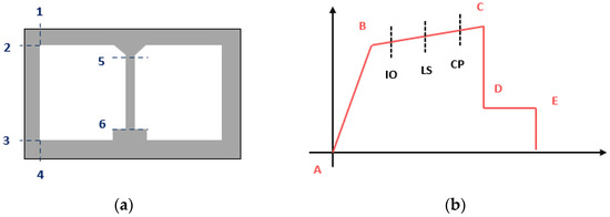 (a) Location of hinges for the analysis of rectangular tunnels; (b) definition of hinges response and damage states (IO: Immediate Occupancy limit state, LS: Life Safe limit state, CP: Collapse Prevention limit state, redrawn after Huh et al. [76]).