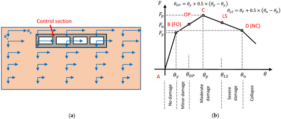 (a) Conceptual model for pushover analysis of an embedded structure and definition of control section for recording capacity, (b) thresholds of damage/performance states on shear force–drift capacity curve derived via pushover analysis (θy: drift ratio corresponding to yield point B, θp: drift ratio corresponding to peak strength point C, θu: drift ratio corresponding to ultimate strength point D defined at the moment when shear force drops to 85% of the peak force, θOP: drift ratio threshold for performance state: OP, θLS: drift ratio threshold for performance state: LS) (modified after He and Chen, [82]).