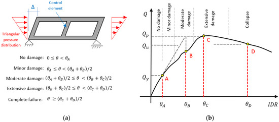 (a) Conceptual model for pushover analysis of an embedded structure/station and definition of control element for recording capacity, (b) definition of thresholds of damage/performance states on shear force–drift capacity curve developed via the pushover analysis (θA: drift ratio corresponding to yield point A, θC: drift ratio corresponding to peak strength point C, θB: drift ratio corresponding to point B, defined by the intersection point between the extension line of the initial stiffness and the horizontal line corresponding to the peak shear force, θD: drift ratio corresponding to ultimate strength point D, defined at the moment when shear force drops to 85% of the peak shear force) (modified after Zhong et al. [85]).