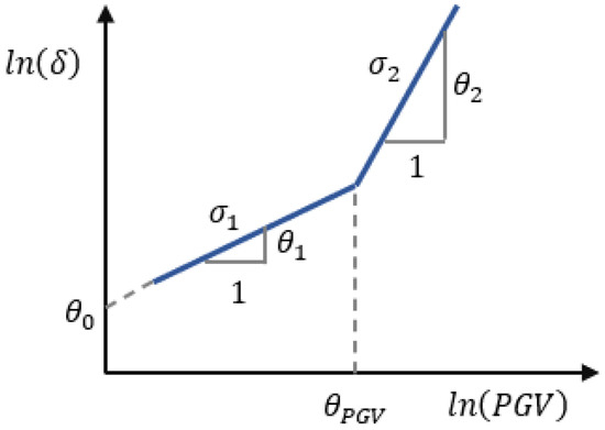 Two approaches are commonly employed in developing fragility functions. The first one includes regression analyses of the data obtained from one of the above methods. More specifically, least-squares regression analyses are conducted on datasets of EDP-IM, commonly in the log–log space, as per the following equation [39,40]:
