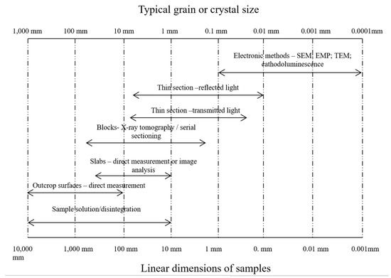 The size distributions of crystals (in igneous and metamorphic rocks), grains (in sedimentary and occasionally metamorphic rocks), and occasional fragments and clasts (in sedimentary and volcanic rocks comprising clasts of previously formed rocks) are amongst the most commonly quantified aspects of rock texture [28]. The size of a crystal or grain is a measure of the space it occupies. A linear measure of size is generally used in geological applications. Figure 1 represents quantitative textural methods that can be used at different scales of interest.