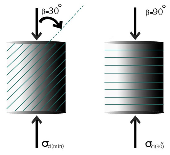 Singh et al. described the concepts of the “type of anisotropy” and “anisotropy ratio”. Based on the origin of the anisotropy curves, three types of anisotropy are distinguished qualitatively: “U type,” “Undulatory type,” and “Shoulder type” (Figure 2) [39]. The concept of the “anisotropy ratio” was presented for quantifying anisotropy in rocks, which is defined as the ratio of UCS of the rock at β = 90° to the minimum strength observed over the range of β from 0 to 90° (Figure 3), which is written in Equation (1) as follows: