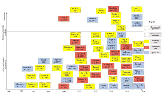The mechanical properties of rocks are markedly influenced by their mineralogical properties [17]. The strongest rocks are generally those that contain quartz as a binding material, followed by calcite (a carbonate species) and ferrous minerals (such as hematite and chromite), whereas rocks that contain clays and phyllosilicates (sheet silicates) for binding materials are weak [46]. Several authors have investigated the links between the mineral composition and geomechanical properties of different rock types. Figure 4 shows the main work of the experimental/empirical and numerical/simulation methods used for the evaluation of the effects of mineralogy and texture parameters on the geomechanical parameters of rock between 1960 and 2021. This chart represents the studies on sedimentary rock (yellow box), igneous rock (blue box), and metamorphic rock (red box). The red and green dashed lines indicate the nature of the study, that is, whether it has a substantial focus on geomechanical properties or rock texture. Researchers have recently devoted increasing attention to using simulation methods for the prediction of rock behavior with different mineralogical assemblages.