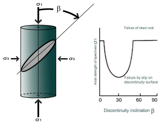 The anisotropy of a rock influences its behavior in engineering analyses. Aagaard investigated the effect of foliation angle on the diametrical point load index of two gneisses and mica schist rocks [125]. The point load index decreases as the foliation angle increases. Behrestaghi et al. indicated that quartzitic and chlorite schists with a low amount of mica exhibit high tensile strength and UCS at all foliation angles [35]. Nasseri et al. studied the impact of anisotropy on the UCS of quartzitic, chlorite, quartz mica, and biotite schists [126]. They showed that all samples displayed the maximum strength when β = 90°, due to the uniform distribution of stress throughout the anisotropy planes, compared with when the foliations are inclined. AL-Harthi studied 10 large blocks of Ranyah sandstone, which had two sets of discontinuities instead of one set of discontinuities [20]. Because of the superimposed effects of bedding and microfissures, an anisotropy curve in the form of a W curve was obtained (Figure 5).