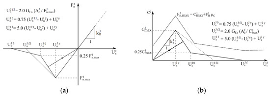 Figure 3 shows the bilinear softening model under tension and shear [33,41]. This model requires the definition of the tensile fracture energy, Gf.n, and of the shear fracture energy, Gf.s. As soon as the local maximum strength values (tensile and shear) are reached, the local maximum normal tensile and the local maximum cohesion values are reduced based on the current damage value, which varies from 0, in the undamaged state, to 1, in a fully damaged state, when only friction prevents interfaces from sliding. If a crack appears under both tensile and shear stresses, it is assumed that such a crack is due to tensile stresses; if a crack appears under both compression and shear stresses, it is assumed that such a crack is due to shear stresses.