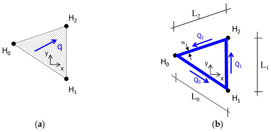 In this approach, it is necessary to define the width of the pseudo seepage channels () associated with the edge of each triangular hydraulic interface. In a first stage, this width is calculated in such a way that the total area of the pseudo seepage channels is equal to the area of the hydraulic interface: