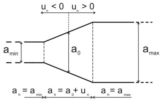 The hydraulic aperture associated with each integration point (both ends of the pseudo seepage channels) is obtained as a function of the interface’s normal displacement (mechanical aperture); of the joint normal displacement (); and of three parameters: , and , following the procedure used in the computational code UDEC [44]: