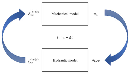 The seepage–stress coupled model results from the coupling between the mechanical model and the hydraulic model. Figure 7 shows the calculation cycle of the hydromechanical model, which evolves over time through the interaction between both domains, in a simple and sequential coupling. At each timestep, the hydraulic apertures are calculated taking into account the discontinuities’ normal displacements calculated with the mechanical model. Then, the water pressures calculated with the hydraulic model are transferred to the mechanical model as effective stresses and the new mechanical apertures are computed.