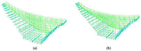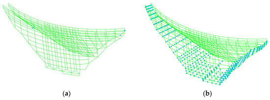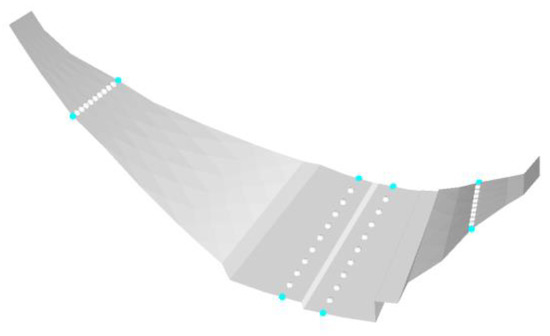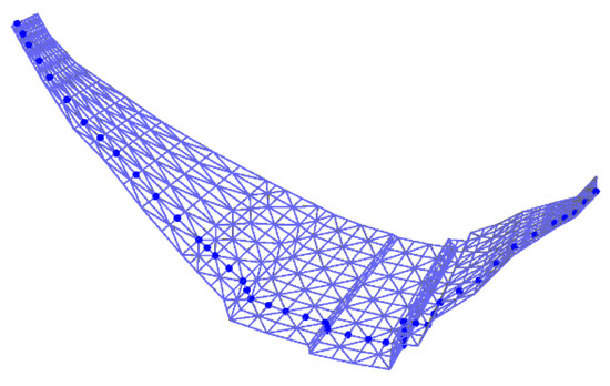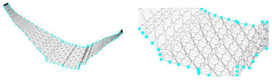 A three-dimensional model of an 83 m high arch-gravity dam and its foundation was created (Figure 8) to carry out hydromechanical analysis and for safety assessment studies. The geometry is based on that of the Ribeiradio dam [47,48], but in this case, the detail of the surface spillway is not included. The dam is simulated by a group of finite element elastic blocks separated by joints, which represent vertical contraction joints. This concrete area is simulated by 1135 hexahedral finite elements, 4840 triangular interface elements to simulate the contraction joints and 19,624 triangular interface elements to consider nonlinear behavior of the dam concrete, with 30,645 nodal points. The foundation is divided into 3884 hexahedral finite elements. Regarding the hydraulic model, it is assumed that dam contraction joints are impervious and seepage takes only place along the seepage channels located at the edges of the triangular joint elements of the dam/foundation joint (Figure 9). This interface has 920 triangular hydraulic interface elements with 21,296 nodal points and 2760 seepage channels.