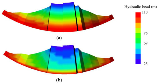 Figure 11 shows the field of hydraulic head at the dam/foundation interface calculated with the hydromechanical model, assuming either a nonoperational or operational drainage system. The hydraulic head (also known as total head, piezometric head, hydraulic potential or simply head) is the sum of the elevation head (distance from some arbitrary datum) and the pressure head (fluid pressure divided by the unit weight of the fluid). In this case, the elevation head is equal to 25 m.
