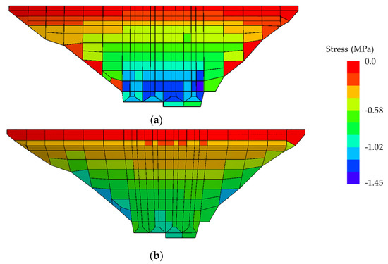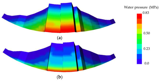 Table 1 shows the mechanical properties of both the dam and the foundation, and Table 2 shows the mechanical properties of the contraction joints (concrete/concrete joints) and of the dam/foundation interface (concrete/rock), based on data presented by Dong et al. [31]. The other parameters required to define the constitutive models SM1 and SM2 are chosen taking into account relations usually considered for such materials [31,34]. In the concrete/concrete interfaces, the normal stiffness (kn) is assumed to be 60.6 Gpa/m and the shear stiffness (ks) is equal to 24.24 Gpa/m. At the dam/foundation interface, it is assumed that kn = 128.8 Gpa/m and kt = 51.52 Gpa/m. At the joint elements representing the dam contraction joints, a Mohr–Coulomb constitutive model with zero tensile strength and zero cohesion is adopted. Assigning a zero tensile strength allows the interfaces to open in areas where tensile stresses occur. With a shear strength defined by zero cohesion and an assumed friction angle, only friction prevents the interfaces from sliding.