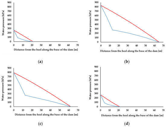 Uplift pressures at the dam/foundation interface: (a) nonoperational drainage system; (b) operational drainage system.